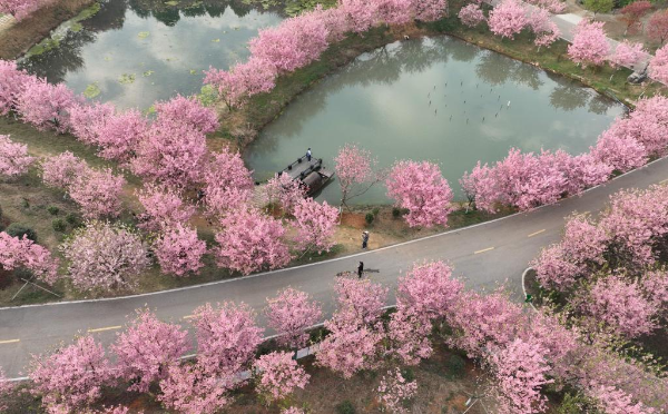 Aerial photo taken on March 11, 2022 shows cherry blossoms in Luoqiao Township of Changning City, central China's Hunan Province. (Xinhua/Zhao Zhongzhi)