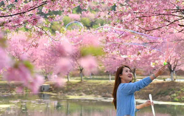 A tourist enjoys herself at a cherry garden in Luoqiao Township of Changning City, central China's Hunan Province, March 11, 2022. (Xinhua/Zhao Zhongzhi)