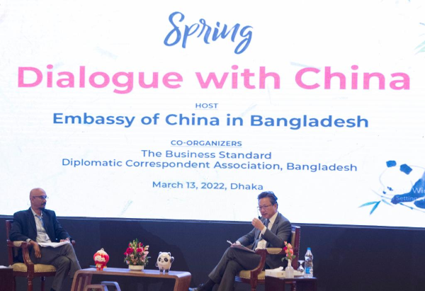 Chinese Ambassador to Bangladesh Li Jiming (R) attends a media briefing session titled "Spring Dialogue with China" held in Dhaka, Bangladesh on March 13, 2022. (Xinhua)