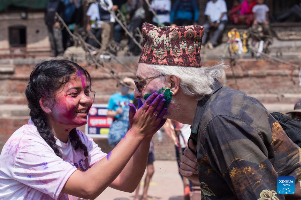 A girl smears colored powder on a tourist during the celebration of Holi, the festival of colors, in Lalitpur, Nepal, March 17, 2022. (Photo by Hari Maharjan/Xinhua)