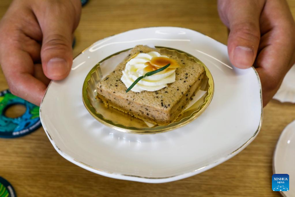 A staff member displays a dessert made with Hainan's local black tea during a culture exhibition featuring tropical rainforest at a theme park of the Boao Forum for Asia (BFA) in Boao, south China's Hainan Province, April 20, 2022.
