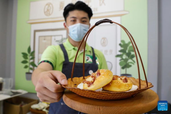 A staff member displays bread made with Hainan's local pork during a culture exhibition featuring tropical rainforest at a theme park of the Boao Forum for Asia (BFA) in Boao, south China's Hainan Province, April 20, 2022.