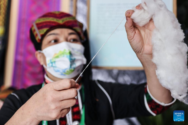 A woman of the Li ethnic group demonstrates spinning during a culture exhibition featuring tropical rainforest at a theme park of the Boao Forum for Asia (BFA) in Boao, south China's Hainan Province, April 20, 2022.