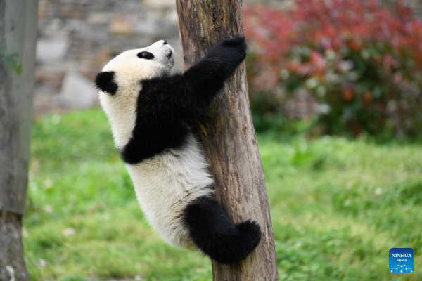 A giant panda climbs a tree at Shenshuping base of China Conservation and Research Center for Giant Pandas in Wolong National Nature Reserve, southwest China's Sichuan Province, April 24, 2022. (Xinhua/Xu Bingjie)