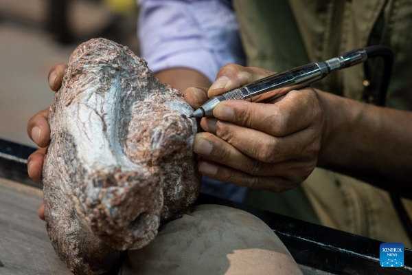 Luo Jiayou works at the Lufeng Dinosaur Fossil Quarry in Chuxiong Yi Autonomous Prefecture, southwest China's Yunnan Province, May 12, 2022.(Xinhua/Hu Chao)