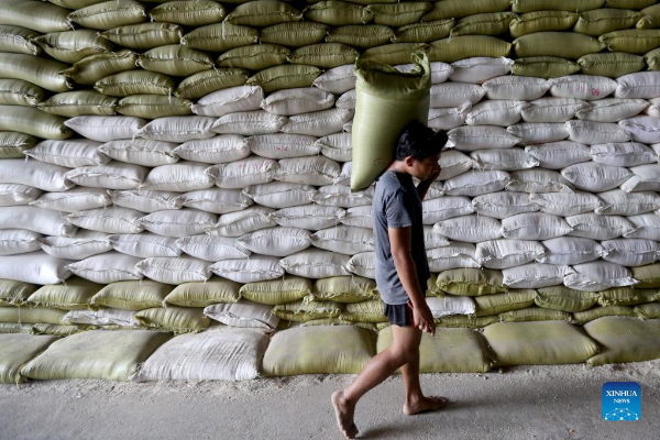 A worker carries a rice bag at a warehouse in Yangon, Myanmar, May 22, 2022. Myanmar exported more than 144,034 metric tons of rice and over 106,912 metric tons of broken rice in April, according to the Myanmar Rice Federation (MRF) on Saturday. (Xinhua/U Aung)