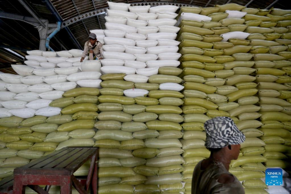 Workers arrange rice bags at a warehouse in Yangon, Myanmar, May 22, 2022. Myanmar exported more than 144,034 metric tons of rice and over 106,912 metric tons of broken rice in April, according to the Myanmar Rice Federation (MRF) on Saturday. (Xinhua/U Aung)