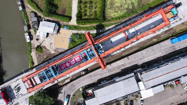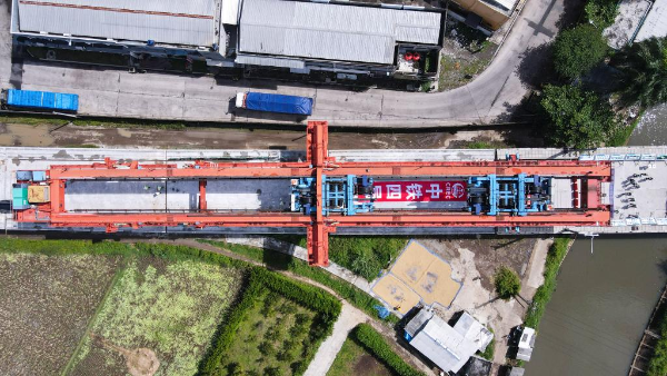 Aerial photo taken on May 25, 2022 shows the construction site of the last box girder on the box girder erection channel at the No. 4 casting yard in Bandung direction of Jakarta-Bandung High-Speed Railway, Indonesia.