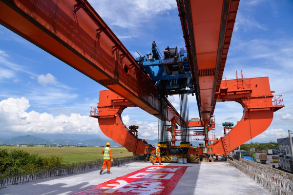 Photo taken on May 25, 2022 shows the construction site of the last box girder on the box girder erection channel at the No. 4 casting yard in Bandung direction of Jakarta-Bandung High-Speed Railway, Indonesia.