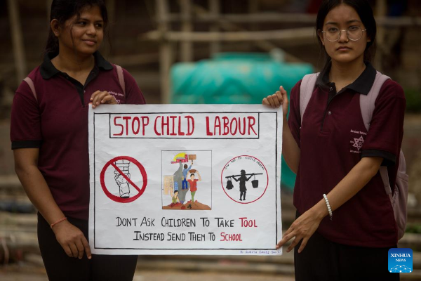 Students hold a poster to mark the World Day Against Child Labor in Kathmandu, Nepal, June 12, 2022. (Photo by Sulav Shrestha/Xinhua)