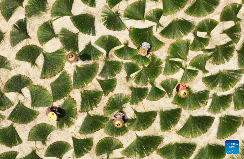 Aerial photo taken on July 6, 2022 shows farmers working at a drying yard in Jinlong Village of Hengyang City, central China's Hunan Province. (Photo by Cao Zhengping/Xinhua)