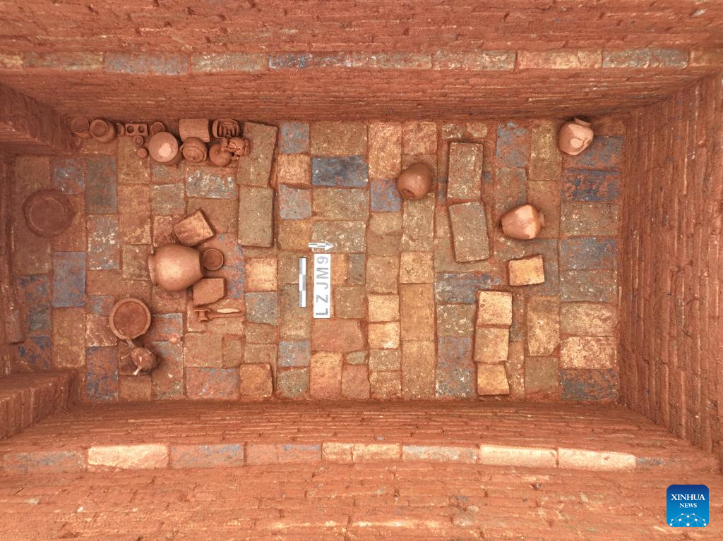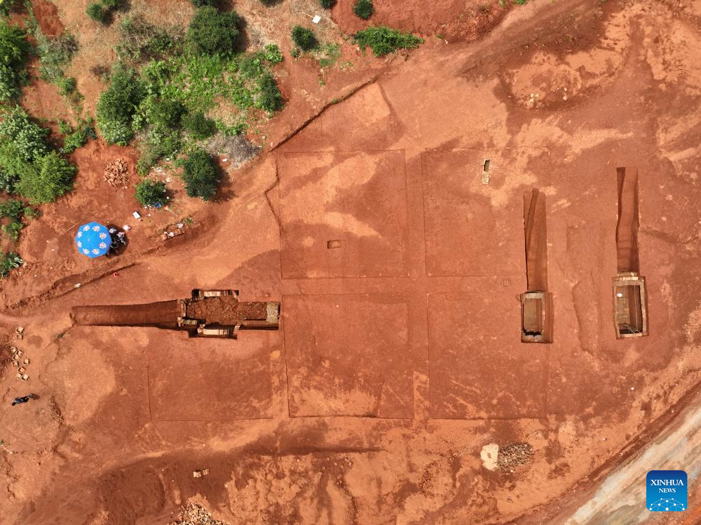 Aerial photo taken on June 28, 2022 shows the cultural relics unearthed in a tomb complex in the city of Leiyang in central China's Hunan Province. Archaeologists have found 14 tombs dating back to between the Eastern Han Dynasty (25-220) and the Tang Dynasty (618-907) in central China's Hunan Province. (Hunan provincial institute of archaeology and cultural relics/Handout via Xinhua)