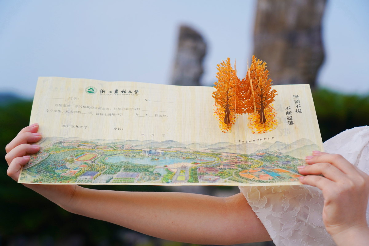 A recipient who opens their admission letter from Zhejiang Agriculture and Forestry University in Zhejiang province, will see a three-dimensional ginkgo tree figure in the top right corner, made of bamboo, symbolizing the school's ecological culture.