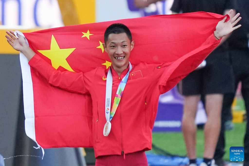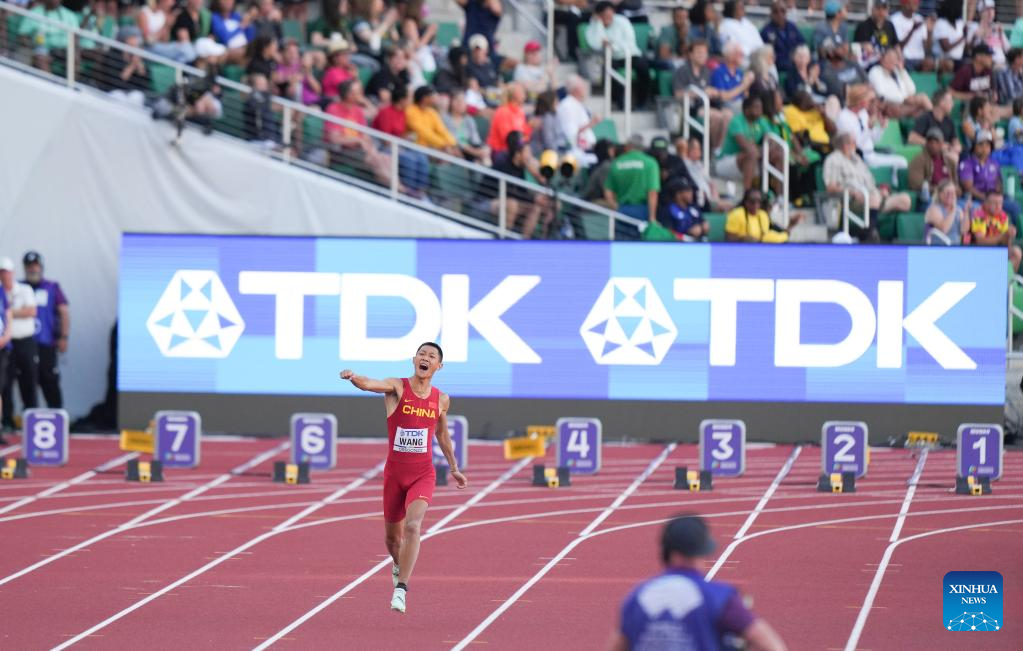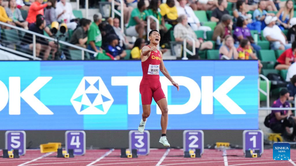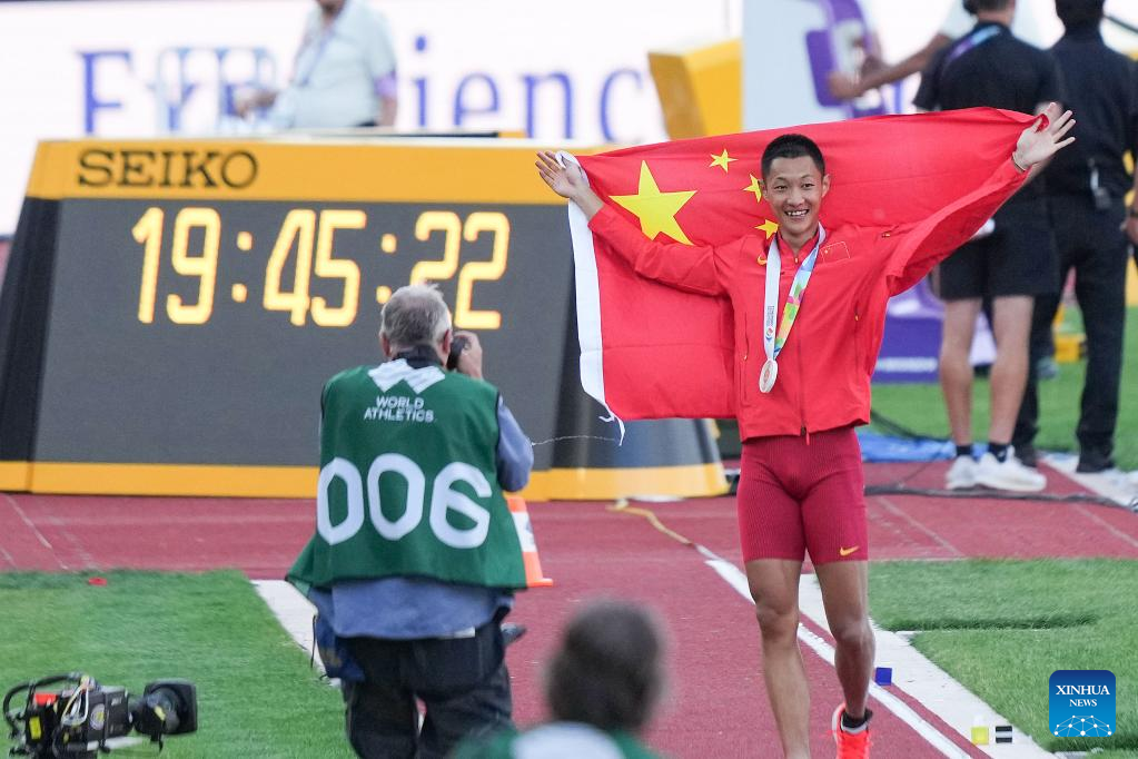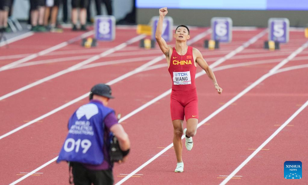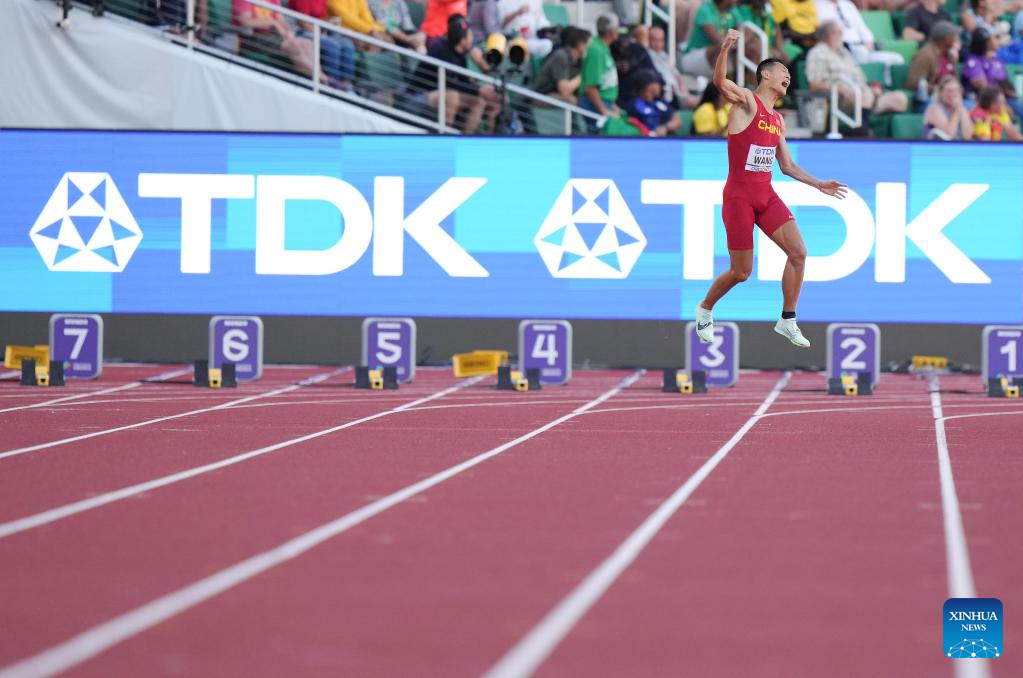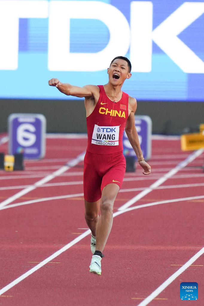 Wang Jianan of China celebrates after winning the men's long jump final at the World Athletics Championships Oregon22 in Eugene, Oregon, the United States, July 16, 2022. (Xinhua/Wu Xiaoling)