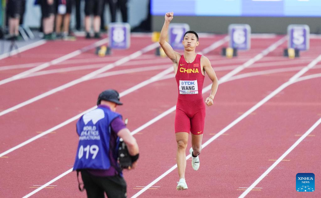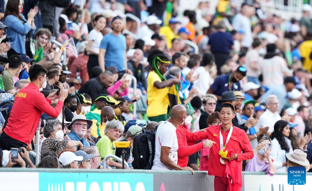 Wang Jianan of China celebrates after his last attempt during the men's long jump final at the World Athletics Championships Oregon22 in Eugene, Oregon, the United States, July 16, 2022. (Xinhua/Wu Xiaoling)