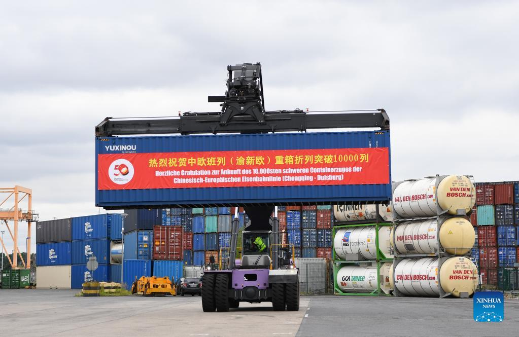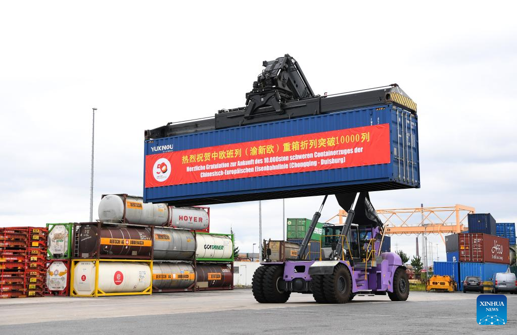 Photo taken on July 11, 2022 shows a scene from the welcome ceremony for the 10,000th trip made by China-Europe freight trains operated by the China-Europe Railway Express (Chongqing) in Duisburg, Germany. A freight train loaded with electronic products, mechanical parts and daily necessities, which departed from southwest China's Chongqing Municipality on June 23, arrived in Duisburg, Germany on Monday. (Xinhua/Ren Pengfei)