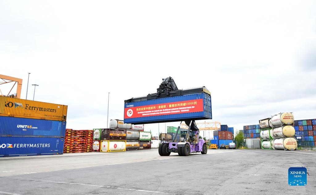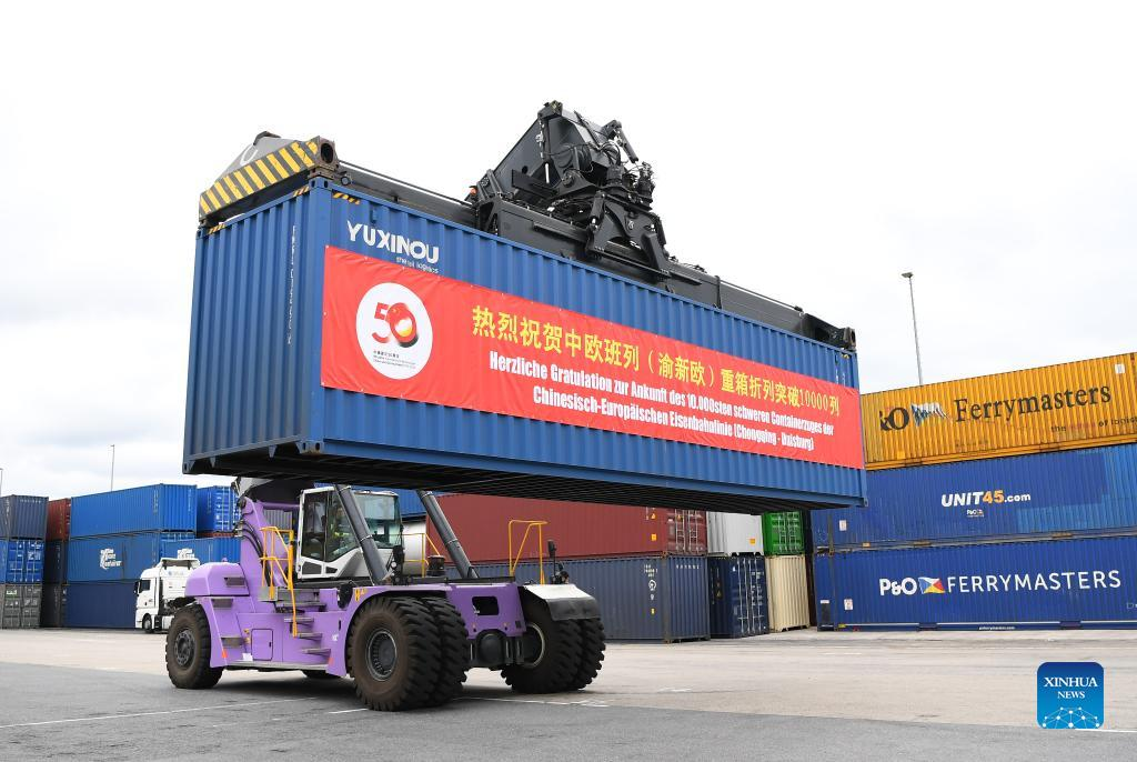 This marked the 10,000th trip made by China-Europe freight trains operated by the China-Europe Railway Express (Chongqing), the first of its kind in China.