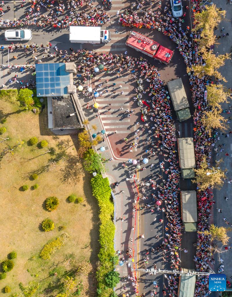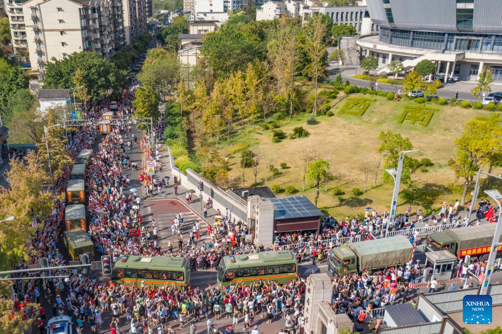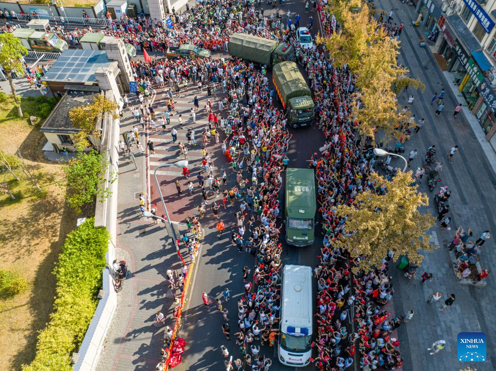 Aerial photo taken on Aug. 28, 2022 shows residents seeing off firefighters from Yunnan Province in Beibei District of southwest China's Chongqing. Over 300 firefighters from Yunnan Province left Chongqing after all open flames of the wildfires that broke out in Chongqing recently had been put out. (Xinhua/Huang Wei)