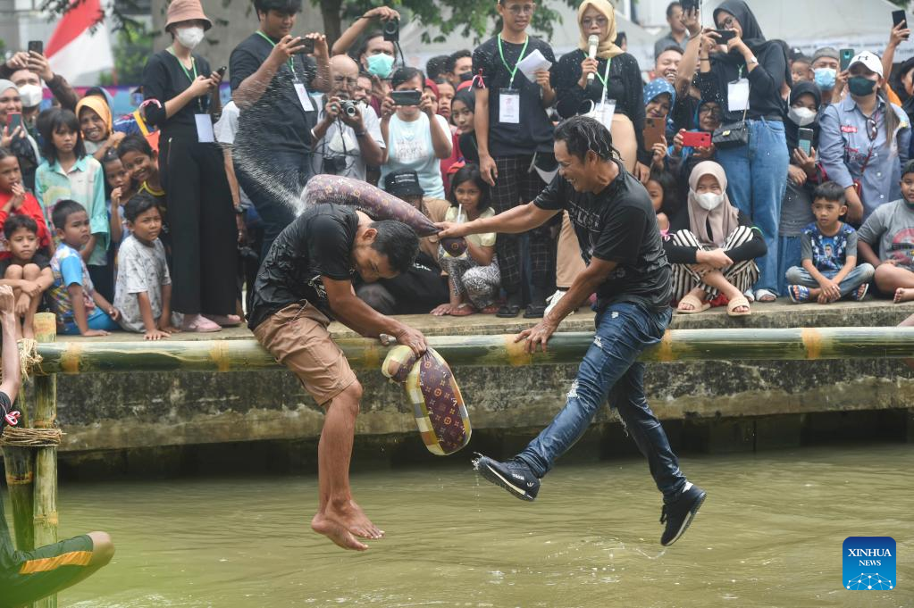 People participate in a pillow fight as part of the celebrations of the Indonesian Independence Day in Jakarta, Indonesia, Aug. 27, 2022. (Xinhua/Zulkarnain)
