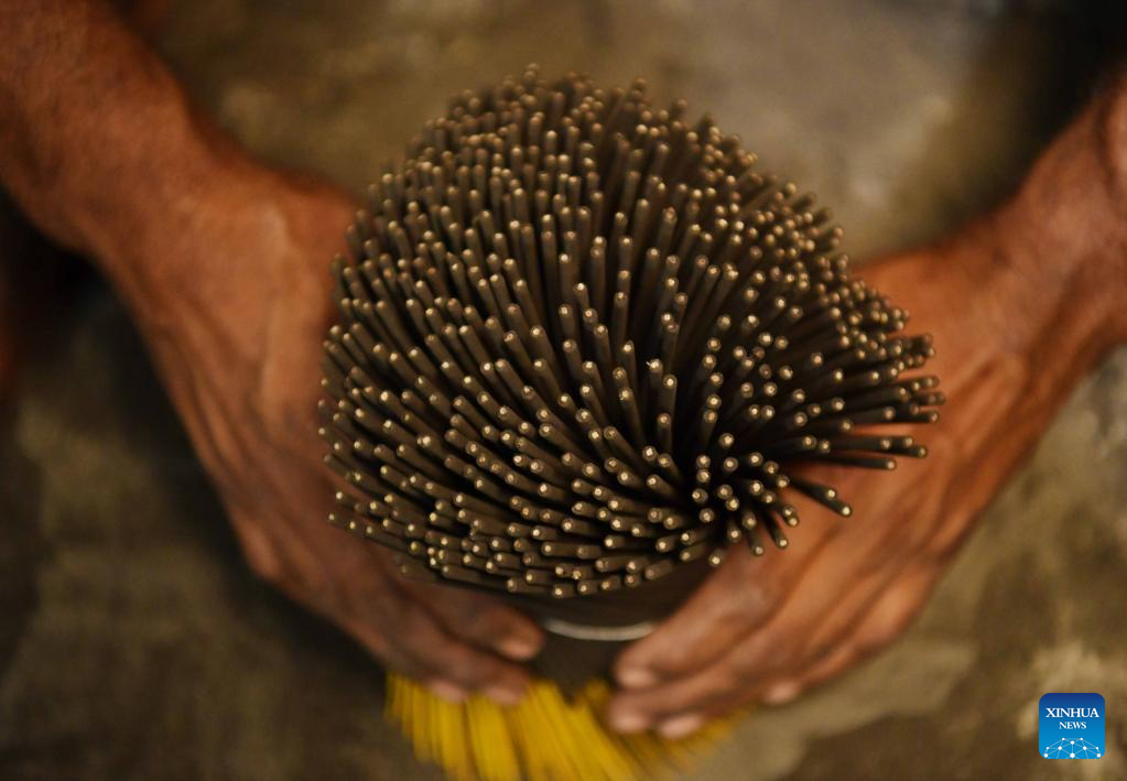 A worker works in an incense stick making factory in Agartala, the capital city of India's northeastern state of Tripura, Aug. 27, 2022. (Str/Xinhua)