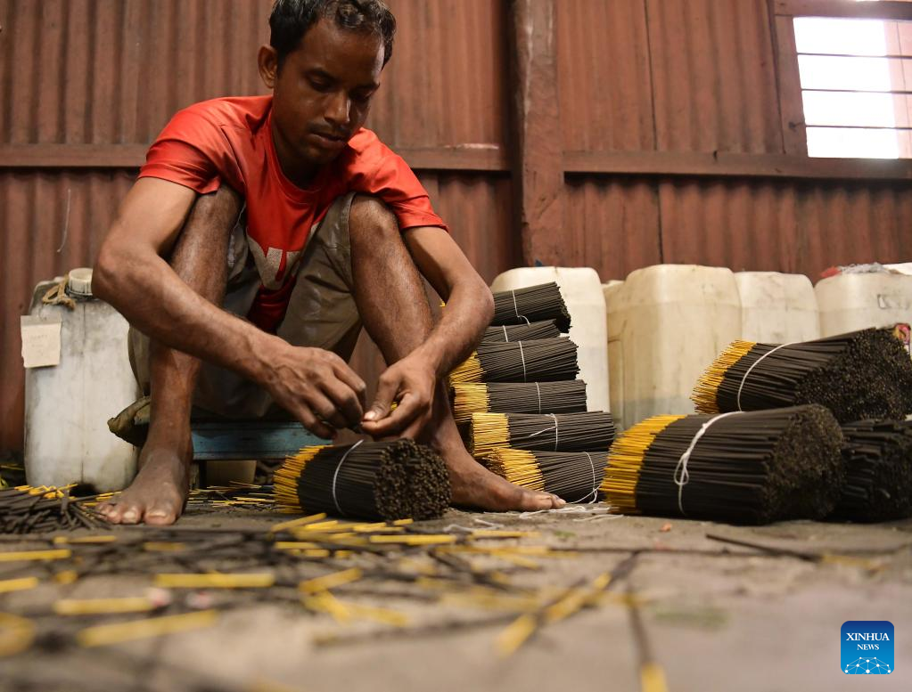 A man works in an incense stick making factory in Agartala, the capital city of India's northeastern state of Tripura, Aug. 27, 2022. (Str/Xinhua)