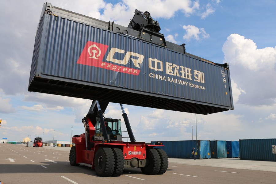 A reach stacker handles cargo containers at the Manzhouli Railway Station in Manzhouli, north China's Inner Mongolia Autonomous Region, July 1, 2020. (Xinhua/Yu Jia)