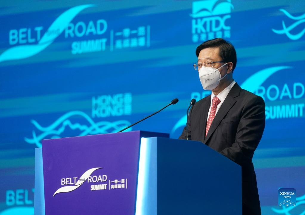 Chief Executive of the Hong Kong Special Administrative Region (HKSAR) John Lee delivers an opening address at the seventh Belt and Road Summit at the Hong Kong Convention and Exhibition Center in Hong Kong, south China, Aug. 31, 2022. Hong Kong, as a participant, contributor, and beneficiary of the Belt and Road Initiative, will get more support in leveraging its unique advantages to participate in and contribute to the building of the initiative, according to the speakers at the seventh Belt and Road Summit that opened here Wednesday. (Xinhua/Wang Shen)