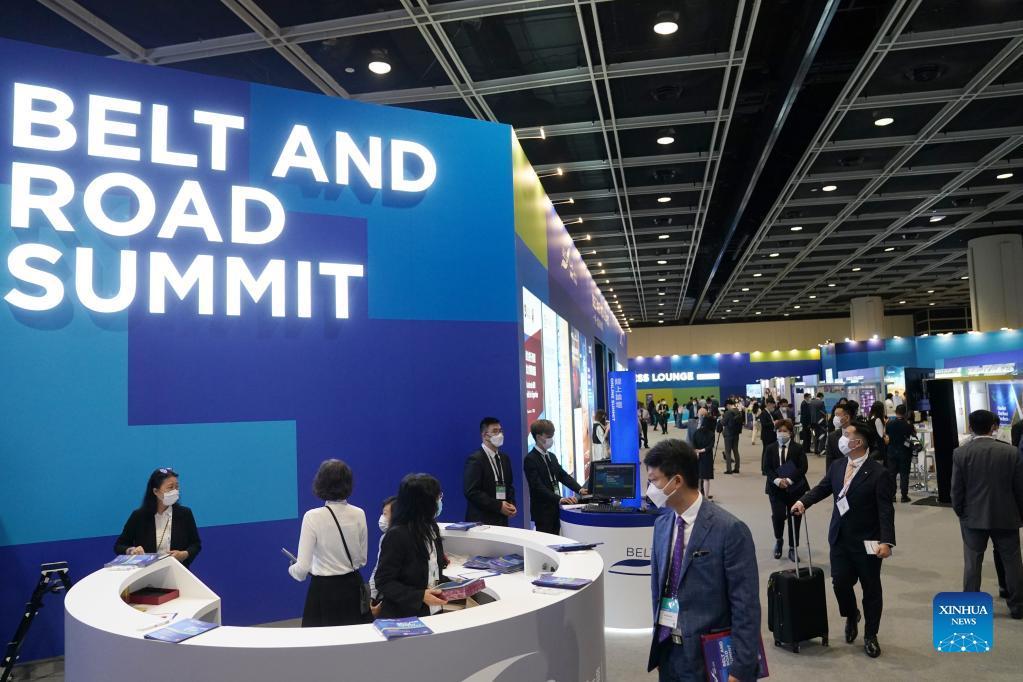 Photo taken on Aug. 31, 2022 shows the seventh Belt and Road Summit at the Hong Kong Convention and Exhibition Center in Hong Kong, south China. Hong Kong, as a participant, contributor, and beneficiary of the Belt and Road Initiative, will get more support in leveraging its unique advantages to participate in and contribute to the building of the initiative, according to the speakers at the seventh Belt and Road Summit that opened here Wednesday. (Xinhua/Wang Shen)