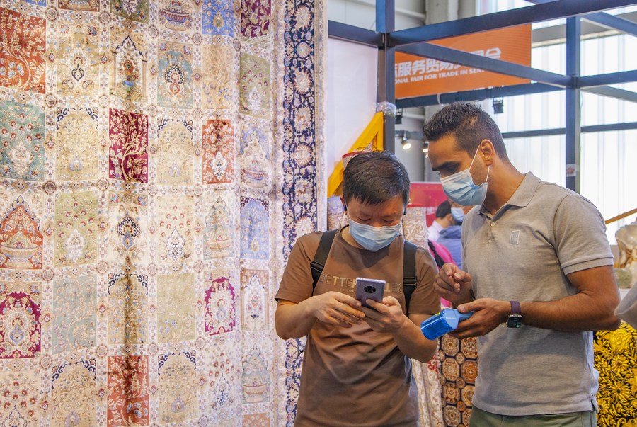 A visitor (L) uses e-payment services to make a purchase at the booth of Pakistan at the cultural and tourism services exhibition area of the 2022 China International Fair for Trade in Services (CIFTIS) in the Shougang Park in Beijing, capital of China, Sept. 5, 2022. (Xinhua/Zhang Fan)