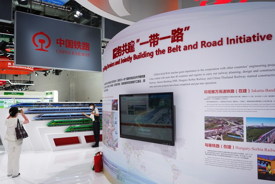 People visit the booth of China Railway at the China National Convention Center during the 2022 China International Fair for Trade in Services (CIFTIS) in Beijing, capital of China, Sept. 5, 2022. (Xinhua/Jin Haoyuan)