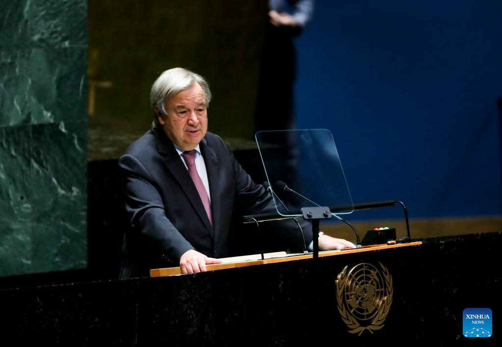 UN Secretary-General Antonio Guterres speaks at the first plenary of the 77th session of the UN General Assembly at the UN headquarters in New York, on Sept. 13, 2022. The 77th session of the UN General Assembly opened on Tuesday, and UN Secretary-General Antonio Guterres called for solidarity among member states to address common challenges. (Xinhua/Wang Ying)
