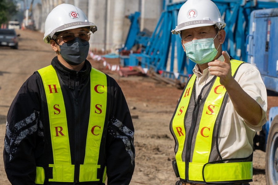 Viroj Lubkritcom (R), a project supervisor of the China Railway Design Corporation (Thailand Branch), works at a construction site of the China-Thailand railway in Nakhon Ratchasima province, Thailand, Sept. 7, 2022. (Xinhua/Lin Hao)