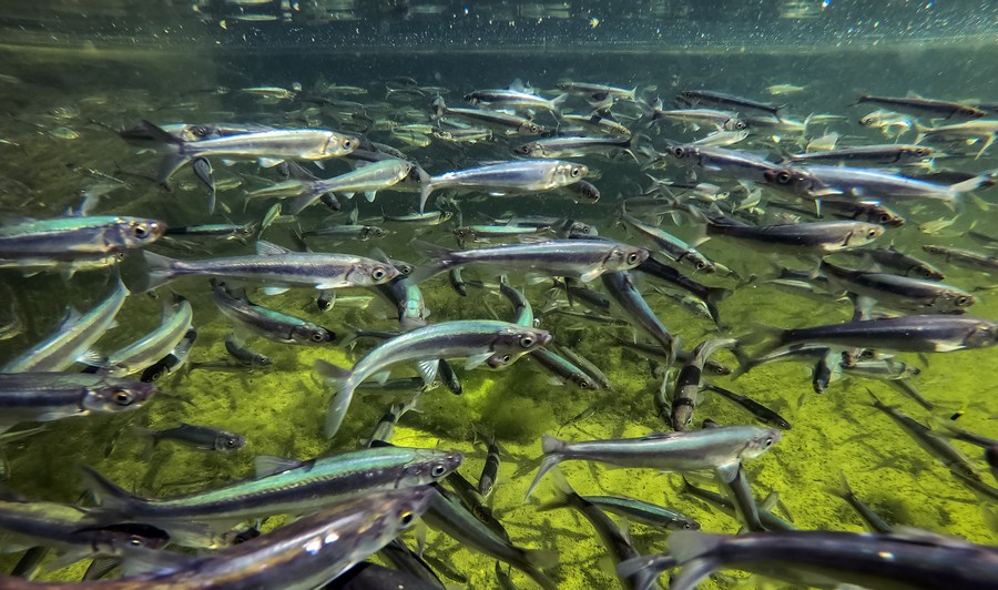 Photo taken on June 19, 2022 shows the Kanglang white minnow, or Anabarilius grahami at an aquatic product breeding base in Yiliang County, southwest China's Yunnan Province. (Xinhua/Jiang Wenyao)
