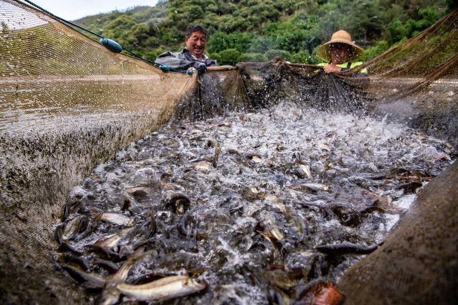 Photo taken on June 19, 2022 shows workers catching indigenous fish at an aquatic product breeding base in Yiliang County, southwest China's Yunnan Province. (Xinhua/Jiang Wenyao)
