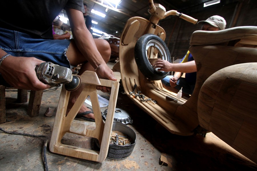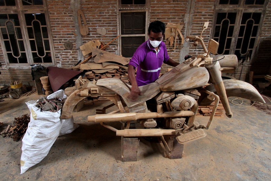 A worker makes a wooden craft motorbike at Tetap Jaya Art wooden workshop in Boyolali, Central Java, Indonesia. Oct. 11, 2022. (Photo by Bram Selo/Xinhua)
