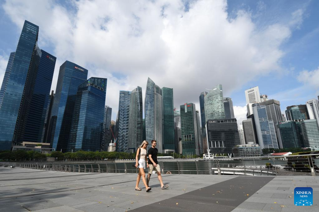 Tourists walk along the Marina Bay in Singapore on Oct. 14, 2022. Singapore's Ministry of Trade and Industry announced on Friday that based on advance estimates, the country's gross domestic product (GDP) grew by 4.4 percent year on year in the third quarter of 2022. (Photo by Then Chih Wey/Xinhua)