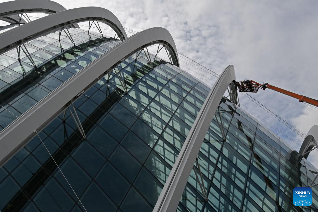 People conduct maintenance work outside the Cloud Forest at Gardens by the Bay in Singapore on Oct. 14, 2022. Singapore's Ministry of Trade and Industry announced on Friday that based on advance estimates, the country's gross domestic product (GDP) grew by 4.4 percent year on year in the third quarter of 2022. (Photo by Then Chih Wey/Xinhua)