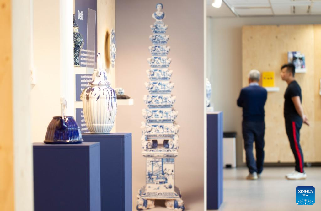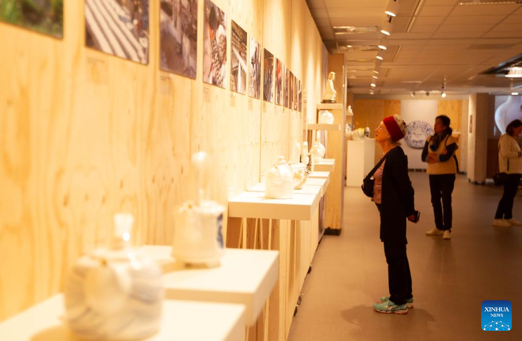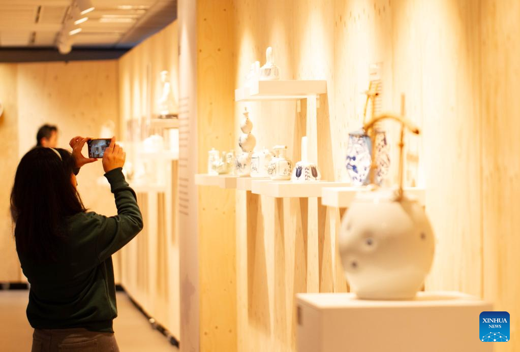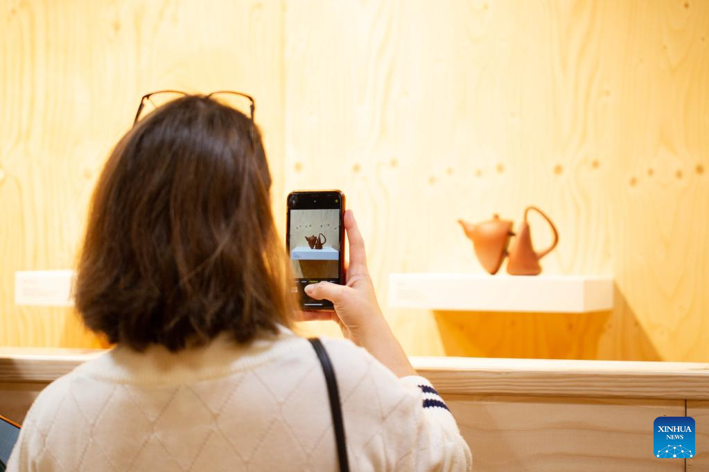 People view potteries at the "Inspired by China, Heritage and Innovation" exhibition at the China Cultural Center in The Hague, the Netherlands, Oct. 14, 2022. (Photo by Sylvia Lederer/Xinhua)