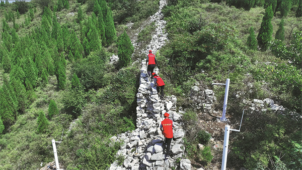 Patrollers check a section of the Great Wall of the ancient Qi state in Zibo, Shandong province.[Photo provided by Hu Deding/For China Daily]