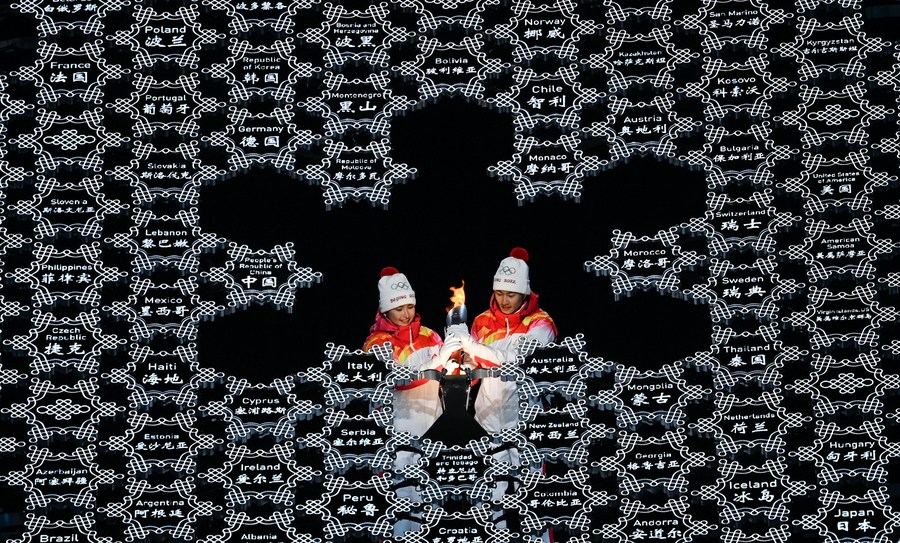 Torch bearers Dinigeer Yilamujiang (L) and Zhao Jiawen set the torch into the Olympic cauldron during the opening ceremony of the Beijing 2022 Olympic Winter Games at the National Stadium in Beijing, capital of China, Feb. 4, 2022. (Xinhua/Li Ga)