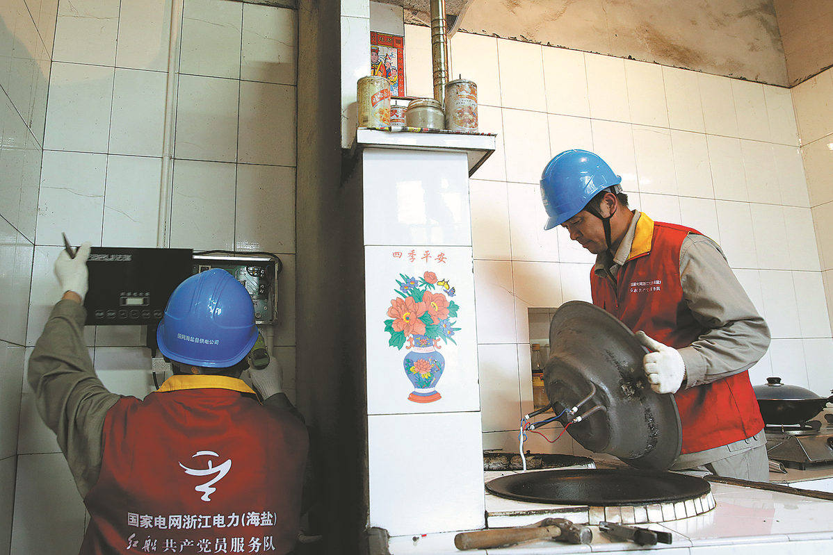 Workers replace traditional household stoves using firewood with e-stoves in Xueshuigang. CHINA DAILY