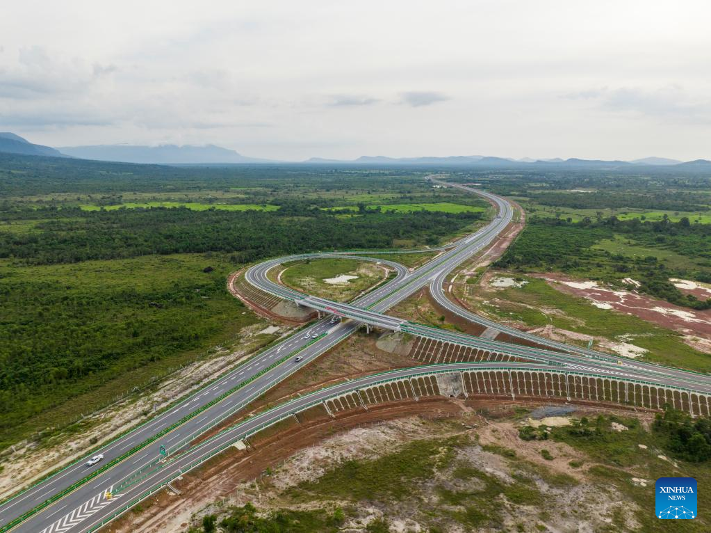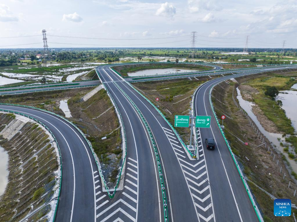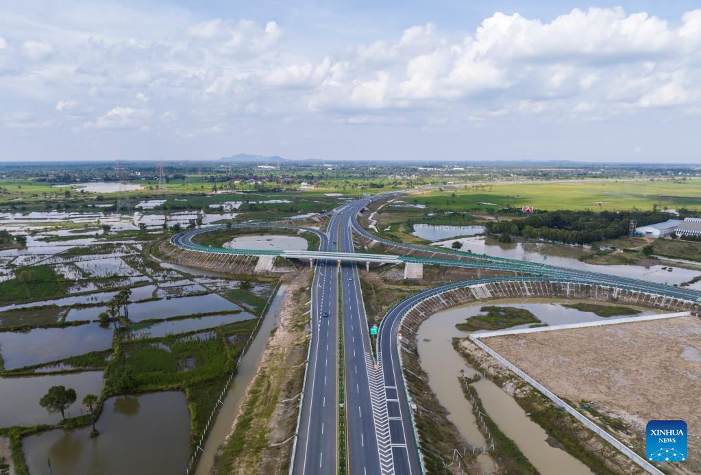This aerial photo taken on Oct. 28, 2022 shows the Phnom Penh-Sihanoukville (PPSHV) Expressway in Preah Sihanouk Province, Cambodia. Connecting the Cambodian capital of Phnom Penh to the international deep-sea port province of Preah Sihanouk, the first Chinese-invested PPSHV Expressway has been giving a significant boost to the country's economic growth and tourism development.