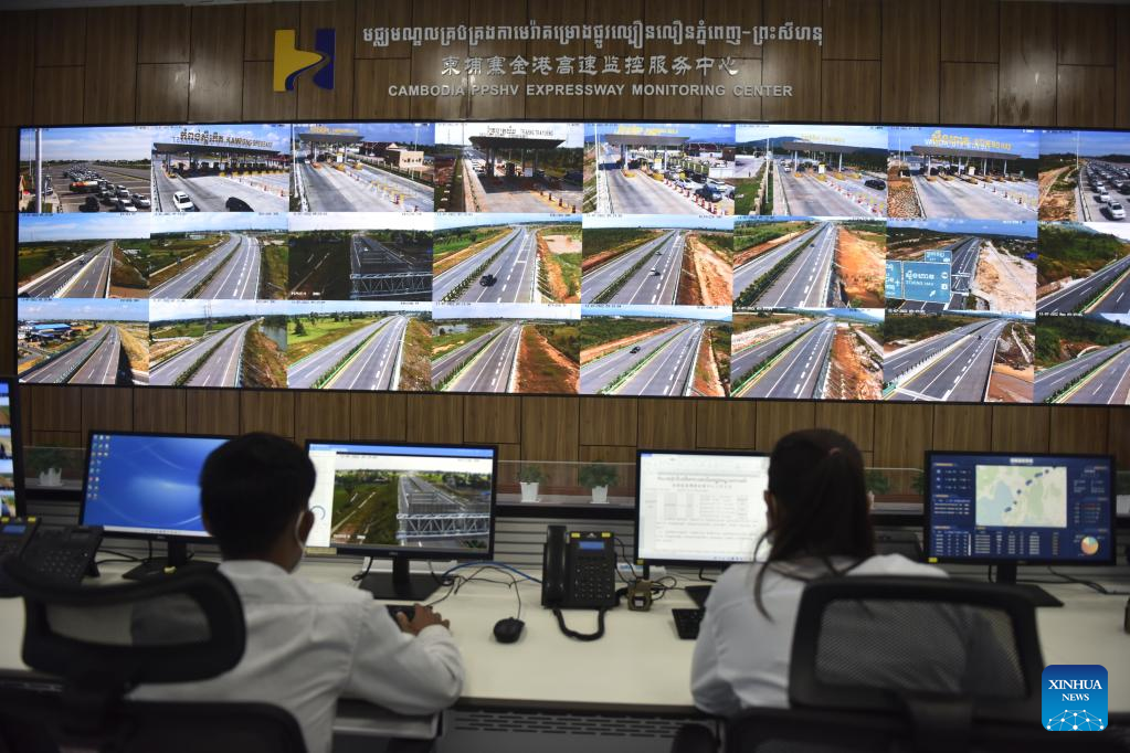 Staff members monitor traffic on the Phnom Penh-Sihanoukville (PPSHV) Expressway at the Monitoring Center in Phnom Penh, Cambodia on Nov. 7, 2022. Connecting the Cambodian capital of Phnom Penh to the international deep-sea port province of Preah Sihanouk, the first Chinese-invested PPSHV Expressway has been giving a significant boost to the country's economic growth and tourism development.