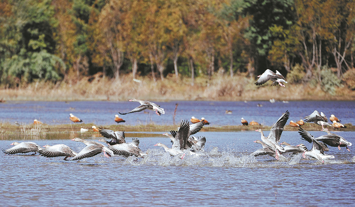 Graylag geese frolic in the waters of Lashi Lake in Lijiang, Yunnan province. [Photo by HE YUNFENG/FOR CHINA DAILY]