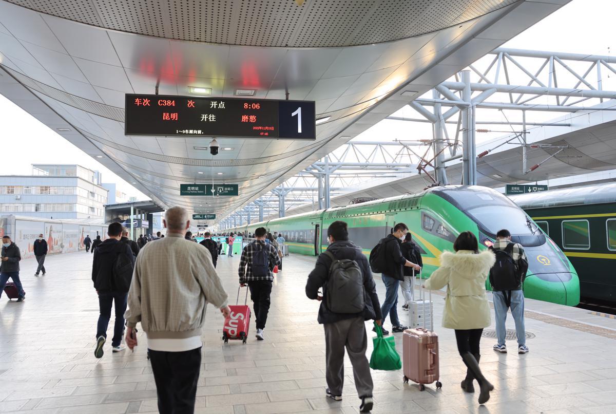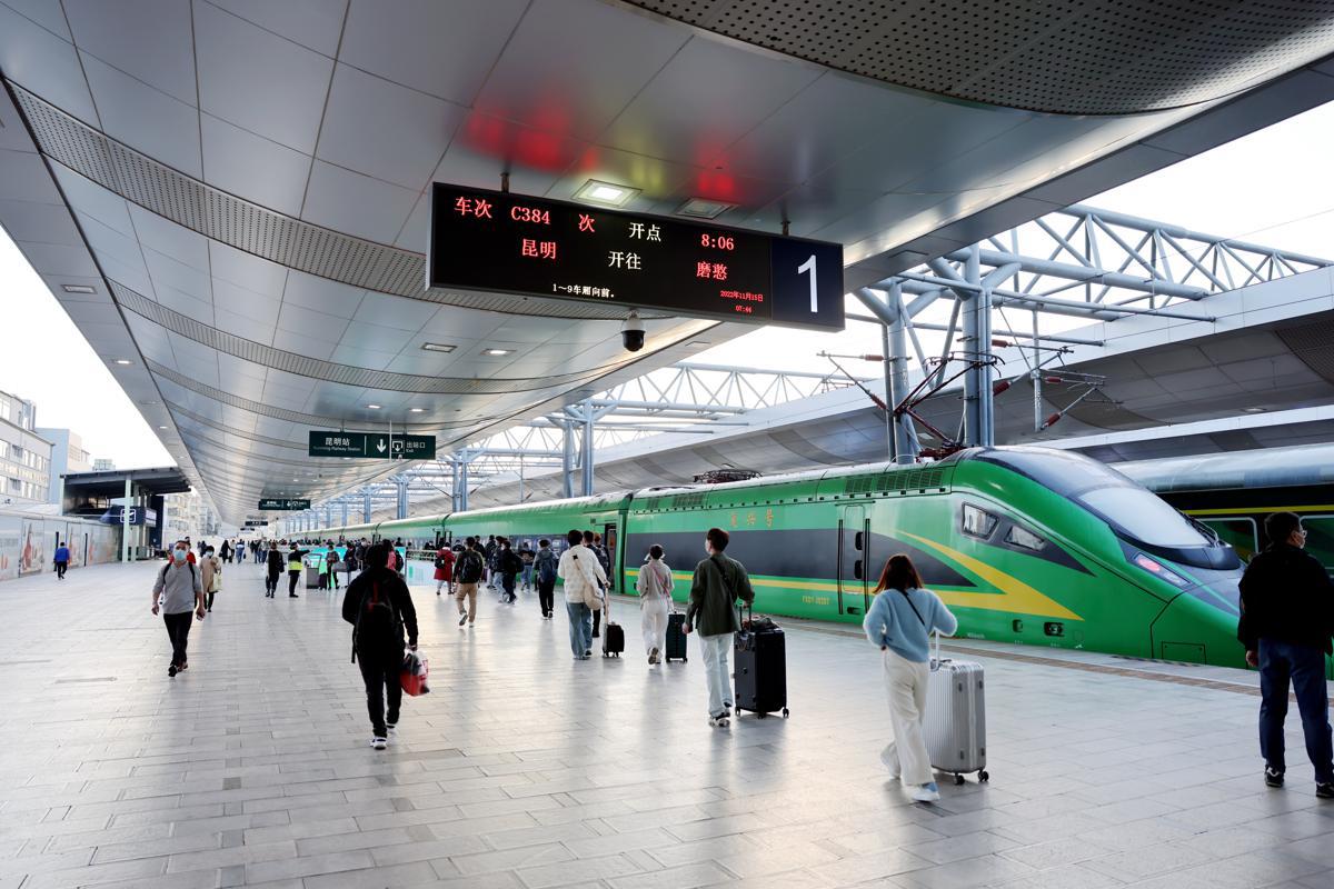 Bullet trains travel between Kunming and Mohan, Yunnan province, the domestic section of the line, taking about 4 hours and 40 minutes. A four-hour stop at the Mohan station gives sufficient time for passengers to complete one-day round trips, according to the China Railway Kunming Bureau Group.