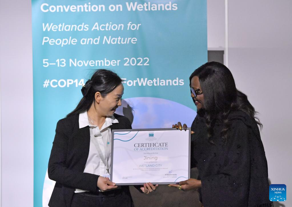 Musonda Mumba (R), secretary-general of the Ramsar Convention, gives the certificate of accreditation that recognises Jining of east China's Shandong Province as the international wetland city to a Chinese representative during the 14th Meeting of the Conference of the Contracting Parties (COP14) to the Ramsar Convention on Wetlands, in Geneva, Switzerland, Nov. 10, 2022. Twenty-five cities from 13 countries, notably seven from China, were accredited on Thursday by the Ramsar Convention as international wetland cities. (Xinhua/Lian Yi)