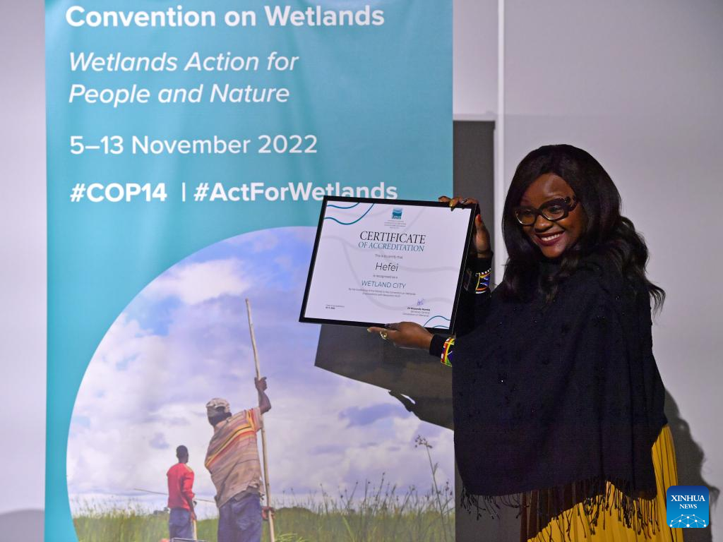 Musonda Mumba, secretary-general of the Ramsar Convention, displays the certificate of accreditation that recognises Hefei of east China's Anhui Province as the international wetland city during the 14th Meeting of the Conference of the Contracting Parties (COP14) to the Ramsar Convention on Wetlands, in Geneva, Switzerland, Nov. 10, 2022. Twenty-five cities from 13 countries, notably seven from China, were accredited on Thursday by the Ramsar Convention as international wetland cities. (Xinhua/Lian Yi)