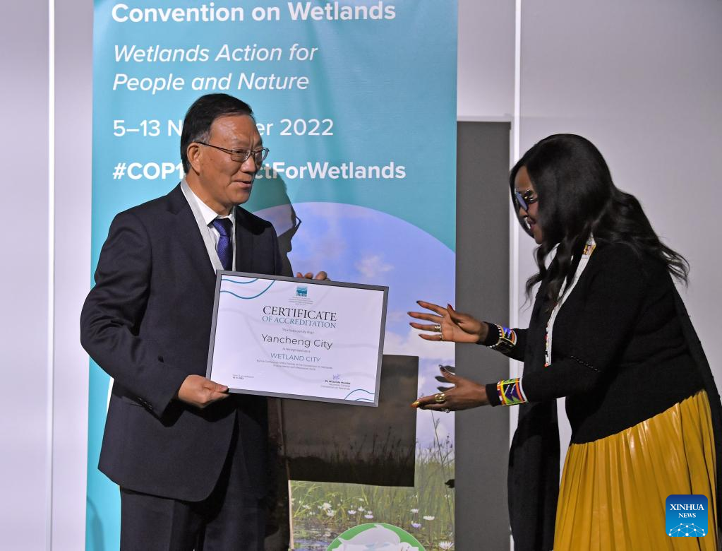 Musonda Mumba (R), secretary-general of the Ramsar Convention, gives the certificate of accreditation that recognises Yancheng City of east China's Jiangsu Province as the international wetland city to a Chinese representative during the 14th Meeting of the Conference of the Contracting Parties (COP14) to the Ramsar Convention on Wetlands, in Geneva, Switzerland, Nov. 10, 2022. Twenty-five cities from 13 countries, notably seven from China, were accredited on Thursday by the Ramsar Convention as international wetland cities. (Xinhua/Lian Yi)