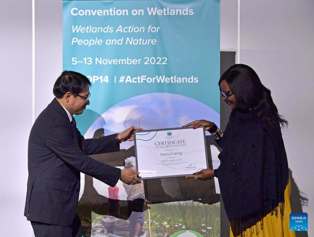 Musonda Mumba (R), secretary-general of the Ramsar Convention, gives the certificate of accreditation that recognises Nanchang of east China's Jiangxi Province as the international wetland city to a Chinese representative during the 14th Meeting of the Conference of the Contracting Parties (COP14) to the Ramsar Convention on Wetlands, in Geneva, Switzerland, Nov. 10, 2022. Twenty-five cities from 13 countries, notably seven from China, were accredited on Thursday by the Ramsar Convention as international wetland cities. (Xinhua/Lian Yi)