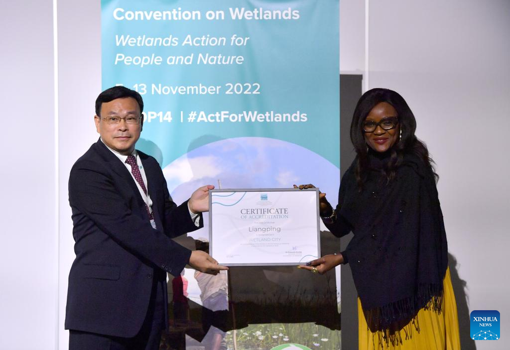 Musonda Mumba (R), secretary-general of the Ramsar Convention, gives the certificate of accreditation that recognises Liangping District of southwest China's Chongqing as the international wetland city to a Chinese representative during the 14th Meeting of the Conference of the Contracting Parties (COP14) to the Ramsar Convention on Wetlands, in Geneva, Switzerland, Nov. 10, 2022. Twenty-five cities from 13 countries, notably seven from China, were accredited on Thursday by the Ramsar Convention as international wetland cities. (Xinhua/Lian Yi)